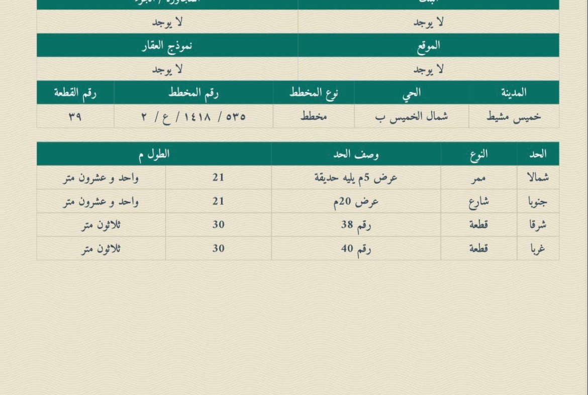 ارض للبيع – خميس مشيط مخطط شمال الخميس 7 ب رقم القطعه 39 مساحتها 630 م على واجهتين شارع 20 جنوبي و ممر شمالي 5 م ويليه حديقه