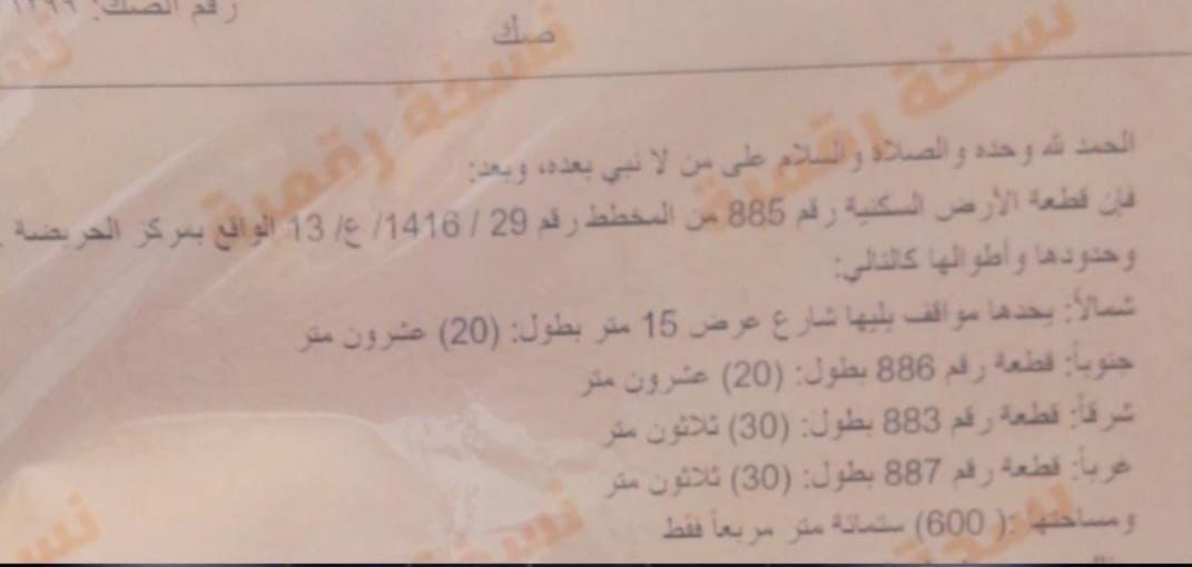 للبيع الارض رقم 885 في مخطط البلديه بالحريضه مخطط معتمد رقم 29 مساحتها 600 متر مربع على مواقف يليها شارع 15 متر بصك الكتروني مستويه