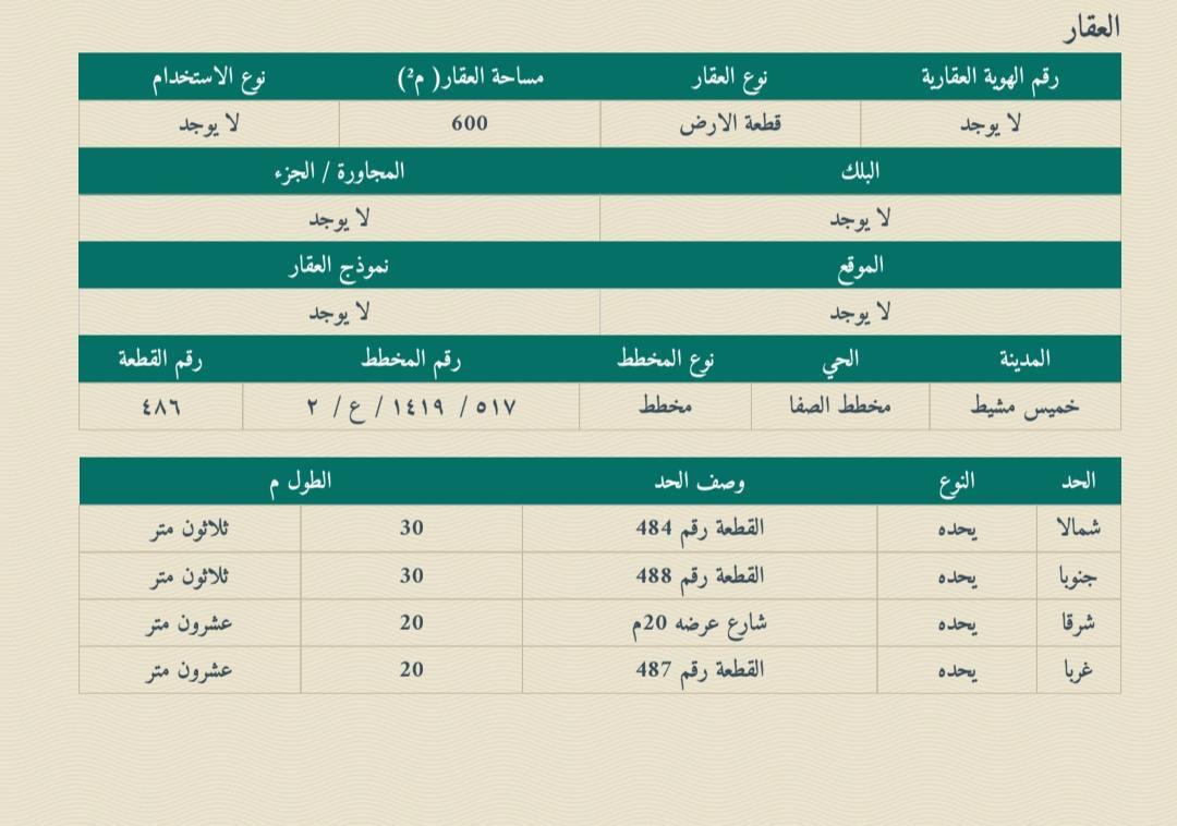 للبيع بخميس مشيط أرض للبيع بمخطط النور (الصفا) طريق وادي بن هشبل قبل الصناعيه على اليمين مساحتها 600 م شارع 20 شرقي مستويه